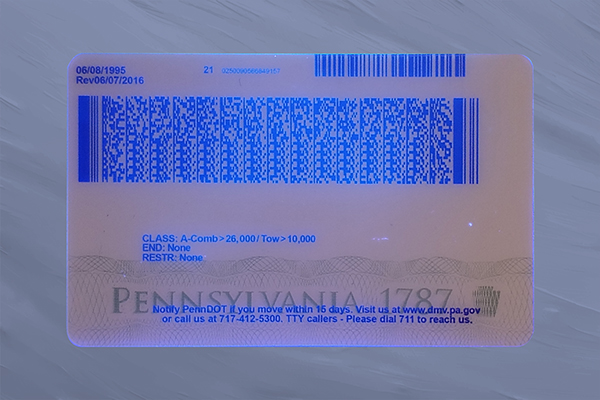 - Use a UV light to reveal Pennsylvania-style security patterns on the front surface